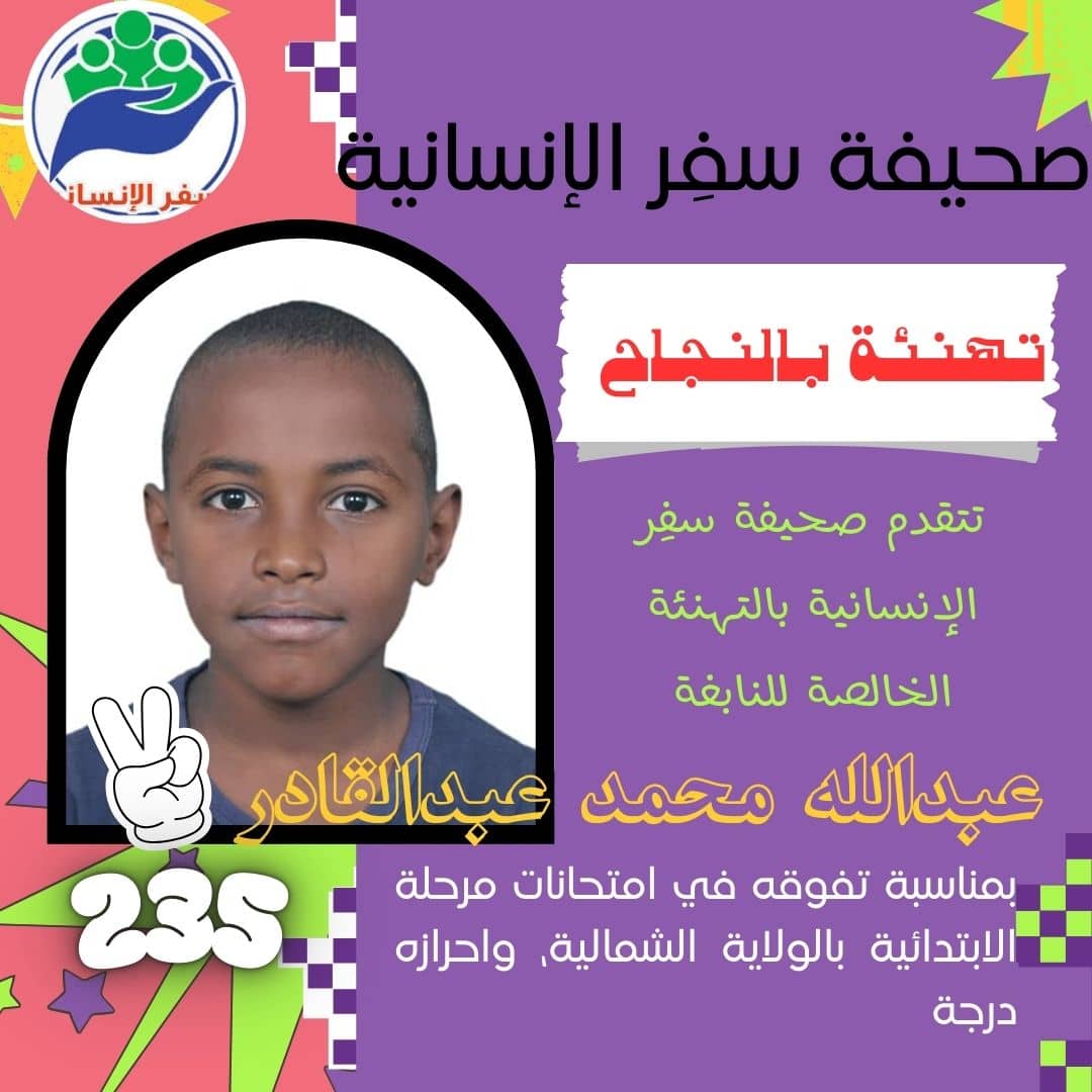 بمناسبه تفوقه في امتحانات المرحلة الابتدائية بالولاية الشمالية..وإحرازه ٢٣٥ درجة.
